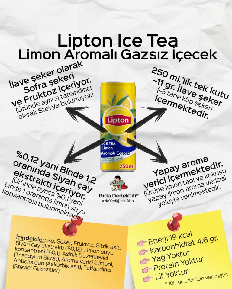 Ürün bu haliyle 250 ml’lik tek porsiyonda 61 kcal enerji verirken, bu kalorinin tamamı ilave şekerden geliyor. Üründe tek porsiyonda 14 gr şeker yani yaklaşık 7 küp şeker bulunuyor. Ürün ayrıca besin değerleri beyanında 100 ml’de 0,6 gr yani 250 ml’de 2 gr lif içerdiği beyanıyla satılıyor. Fakat ürün içeriğinde 250 ml’de 2 gr life denk gelen bu beyanın gerçeğe uygun olmadığını düşünüyoruz. Öyle ki, ürün içeriğinde bu oranda lif kaynağı olabilecek bir bileşen bulunmuyor. Bu açıdan üründeki bu lif oranının yetkili merciler tarafından değerlendirilmesinin tüketiciyi doğru bilgilendirme açısından önem arz ediyor.