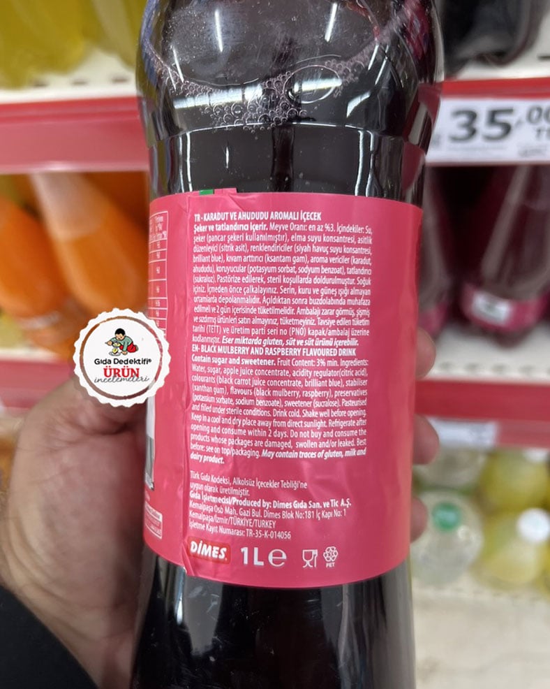 🔍İçindekiler: Su, Şeker, Elma suyu konsantresi, Asitlik Düzenleyici (Sitrik asit), Renklendiriciler (Siyah havuç suyu konsantresi, Brilliant Blue), Kıvam arttırıcı (Ksantan gam), Aroma vericiler (Karadut, Ahududu), Koruyucular (Potasyum Sorbat, Sodyum Benzoat), Tatlandırıcı (Sukraloz)