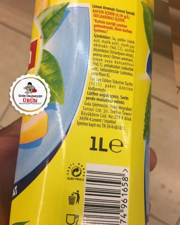 🔍İçindekiler: Su, Asitler (Sitrik asit, Malik asit), Siyah çay ekstraktı (%0,12), Asitlik Düzenleyici (Trisodyum Sitrat), Aroma verici (Limon aroması), Limon suyu konsantresi (%0,1), Antioksidan (Askorbik asit), Tatlandırıcılar (Sukraloz, Asesülfam Potasyum)