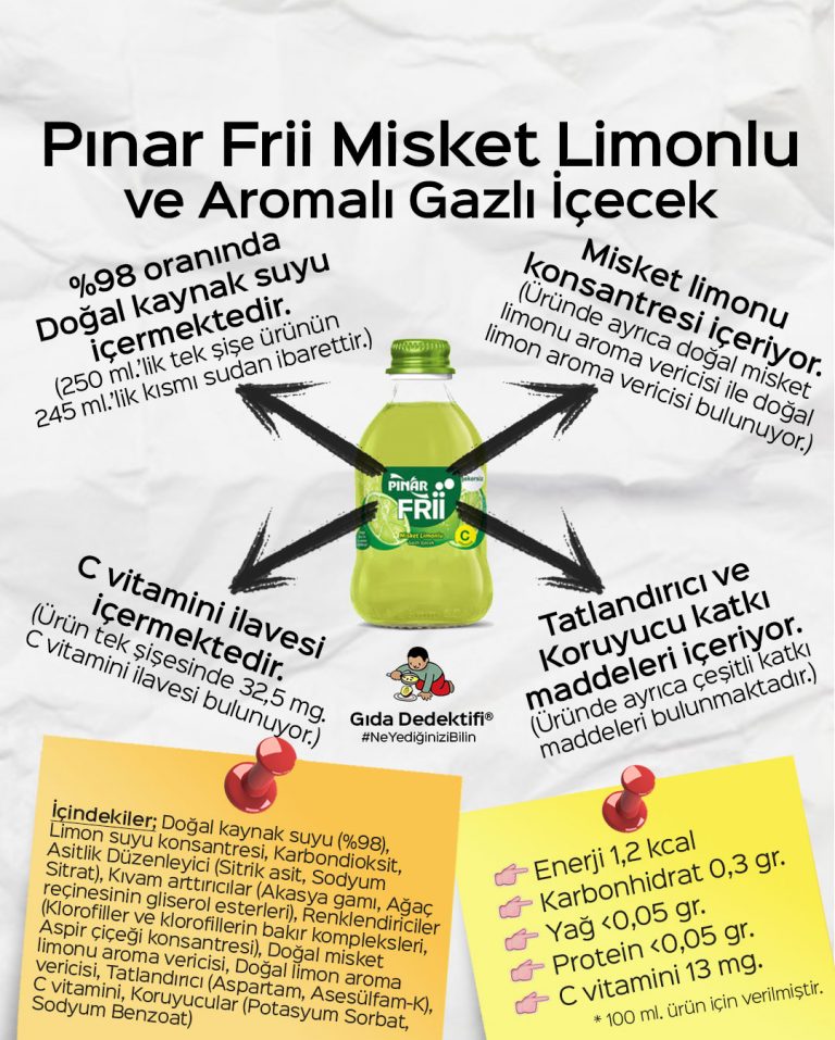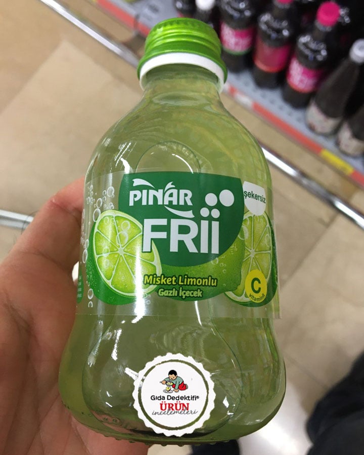 Geçtiğimiz yıl piyasaya çıkan gazlı içeceklerden biri olan Pınar Frii ürününü güncel içerikleri üzerinden inceleyeceğiz. Güncel içerikleri diyoruz çünkü ürün piyasaya ilk çıktığında tek şişede tam 29 gr. ilave şeker içeren bir gazlı içecekti. Şimdi market raflarında yer alan üründe ise ilave şeker yerine Aspartam ve Asesülfam Potasyum gibi tartışmalı yapay tatlandırıcılar kullanılıyor. Ürün ayrıca koruyucu, kıvam arttırıcı, renklendirici gibi çeşitli katkı maddeleri bulunmaktadır. Ürün 250 ml.’lik şişelerde satılmaktadır.