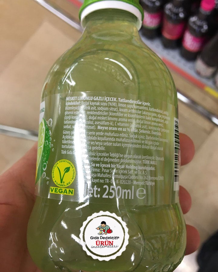 🔎İçindekiler: Doğal kaynak suyu (%98), Limon suyu konsantresi, Karbondioksit, Asitlik Düzenleyici (Sitrik asit, Sodyum Sitrat), Kıvam arttırıcılar (Akasya gamı, Ağaç reçinesinin gliserol esterleri), Renklendiriciler (Klorofiller ve klorofillerin bakır kompleksleri, Aspir çiçeği konsantresi), Doğal misket limonu aroma vericisi, Doğal limon aroma vericisi, Tatlandırıcı (Aspartam, Asesülfam-K), C vitamini, Koruyucular (Potasyum Sorbat, Sodyum Benzoat)