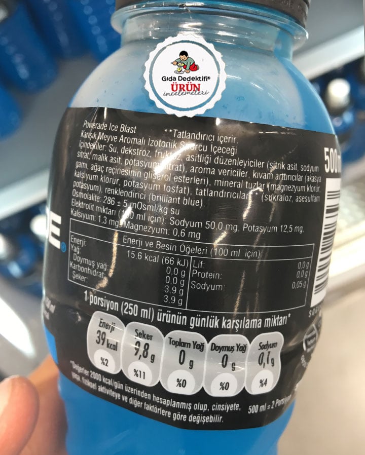 Ülkemizde Coca Cola Türkiye tarafından üretilerek satışa sunulan ve “sporcu içeceği” olarak bilinen Powerade Ice Blast çeşidini inceleyeceğiz. Ürün 250 ml.’lik sporcu kapağına sahip şişelerde satılıyor. Ürün içeriğinde yoğun sıvı tüketen sporculara yönelik çeşitli mineral ilaveleri bulunuyor. Mevzuat çerçevesinde ürünün isminin de Karışık Meyve Aromalı İzotonik Sporcu İçeceği olduğunu söyleyelim.