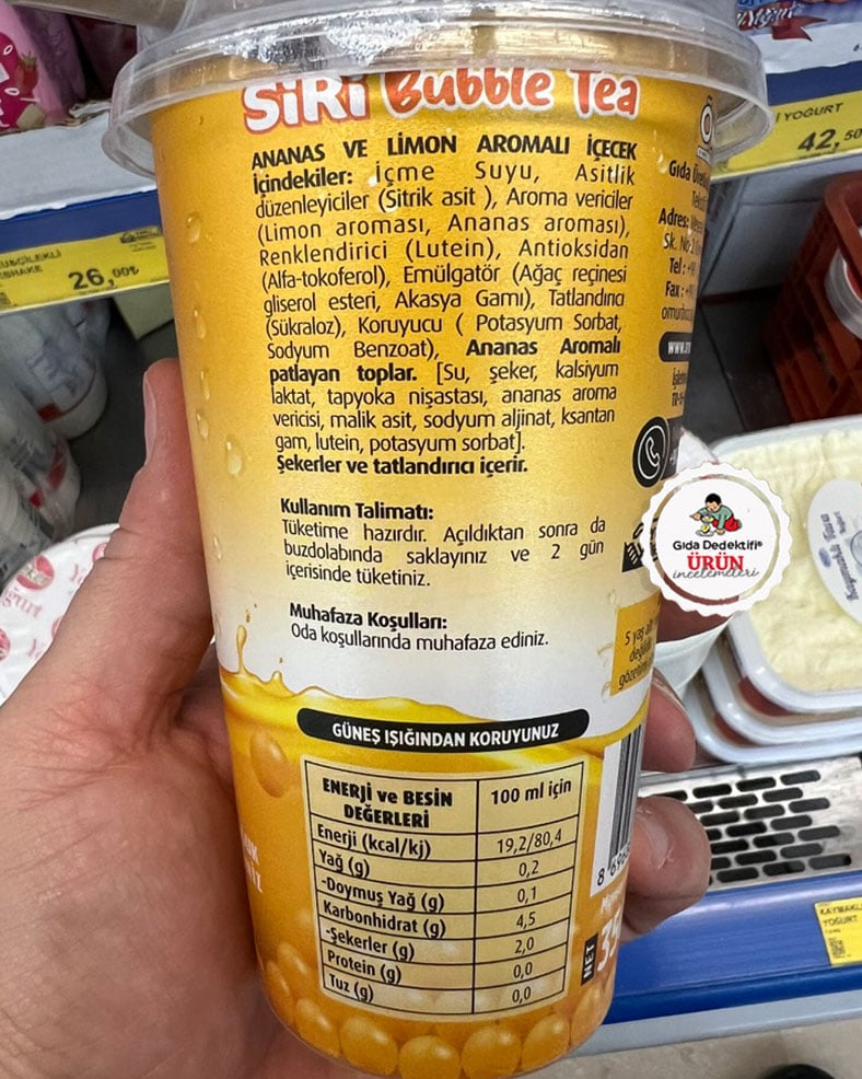 Ürün içeriğine baktığımızda ilk sırada içme suyu yer alıyor. Üründe içme suyu haricinde asitlik düzenleyici, aroma verici, renklendirici, antioksidan, emülgatör, tatlandırıcı ve koruyucu katkı maddeleri olduğu görülüyor. Üründe limon aroma vericisi ile ananas aroma vericisi bulunurken, ayrıca tatlandırıcı olarak Sukraloz yer alıyor. Üründe ayrıca koruyucu katkı maddeleri potasyum sorbat ve sodyum benzoat yer alıyor. Bubble tea yani patlayan çay adıyla satılan üründe ayrıca “patlayan toplar” olarak tanımlanan ve içeriğinde kalsiyum laktat, malik asit ve sodyum aljinat gibi katkı maddelerinin bulunduğu ananas aromalı bileşenler bulunuyor. Üründeki patlayan top içeriğinde şekerin yanında ayrıca renklendirici ve koruyucu olarak potasyum sorbat bulunuyor.