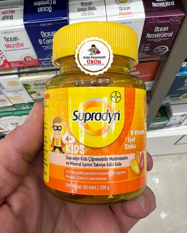 Eczane raflarında yaygın olarak 4-10 yaş arası çocuklara yönelik olarak satışa sunulan, üzerinde süperkahraman görseli bulunan vitamin ve mineral içeren takviye edici gıda ürününü inceleyeceğiz. Ürün 108 gr’lık kavanozlarda satışa sunulurken, tek kavanoz içeriğinde 60 adet çiğnenebilir formda ve çeşitli aromalara sahip tablet bulunuyor. Ürün Bayer firması tarafından Almanya’da üretilerek ülkemize ithal ediliyor.