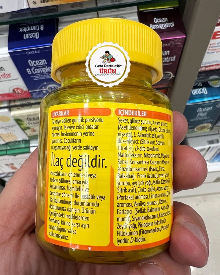 🔎İçindekiler: Şeker, Glikoz şurubu, Kıvam arttırıcı (Asetillendirilmiş nişasta, Okside edilmiş nişasta), L-askorbik asit, Asitlik Düzenleyici (Sitrik asit, Sodyum sitratlar), D-alfa tokoferol, Maltodekstrin, Nikotinamid, Meyve ve sebze konsantresi karışımı [Meyve ve sebze konsantresi (Havuç, Elma, Balkabağı, Frenk üzümü), İnvert şeker şurubu, Ayçiçek yağı, Asitlik Düzenleyici (Sitrik asit)], Çinko sülfat, Aroma verici (Portakal, Limon, Çilek, Vanilya), Retinol, Parlatıcı (Şellak, Balmumu, Karnauba mumu), Siyanokobalamin, Kolekalsiferol, Zeytinyağı, Piridoksin hidroklorür, Fillokuinon, Potasyum iyodür, D-biotin