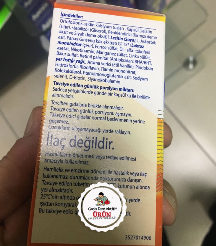 🔎İçindekiler: Ortofosforik asidin kalsiyum tuzları, Kapsül (Jelatin (Sığır), Stabilizör (Gliserol), Renklendirici (Kırmızı demir oksit, Siyah demir oksit)], Emülgatör (Soya lesitini), L-Askorbik asit, Panax Ginseng kök ekstraktı G115, Ferroz sülfat, DL-Alfa-tokoferil asetat, Nikotinamid, Manganez sülfat, Çinko sülfat, Bakır sülfat, Retinil Palmitat, Antioksidan (BHA/BHT, Yer fıstığı yağı), Aroma verici, Piridoksin hidroklorür, Riboflavin, Tiamin mononitrat, Kolekalsiferol, Pteroilmonoglutamik asit, Sodyum selenit, D-biotin, Siyanokobalamin