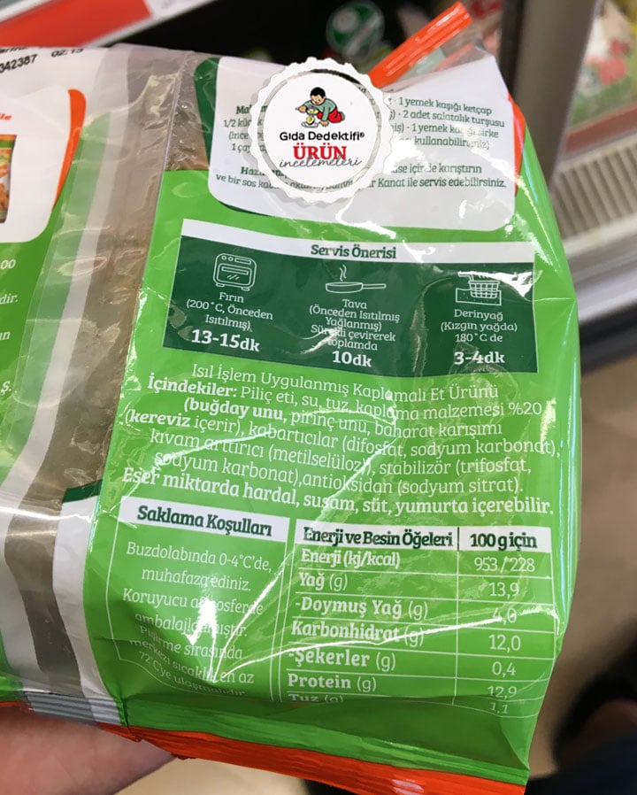 🔍İçindekiler: Piliç eti, Su, Tuz, Kaplama malzemesi (%20) [Buğday unu, Pirinç unu, Baharat karışımı, Kabartıcılar (Difosfat sodyum karbonat), Kıvam arttırıcı (Metilselüloz)], Stabilizör (Trifosfat Sodyum karbonat), Antioksidan (Sodyum Sitrat)