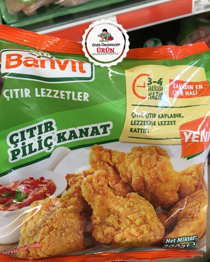 Daha önce farklı bir markaya ait ısıl işlem görmüş piliç ürününü incelemiştik. Bugün ise Banvit markasıyla satılan Çıtır Piliç Kanat ürününü inceleyeceğiz. Ürün 300 gr.’lık paketlerde ısıtılarak tüketmeye hazır şekilde sunuluyor. Ürünün önceden ısıtılmış 200 derecelik fırında 13 ila 15 dk.’da, tavada 10 dk’da veya kızgın yağda 3-4 dakikada hazırlanabileceği belirtiliyor. Ürün içeriğinde herhangi bir bitkisel yağ ilavesi bulunmazken ürünün tavada ya da kızgın yağda tüketildiğinde yağ oranının artacağının hesaba katılması gerekiyor.