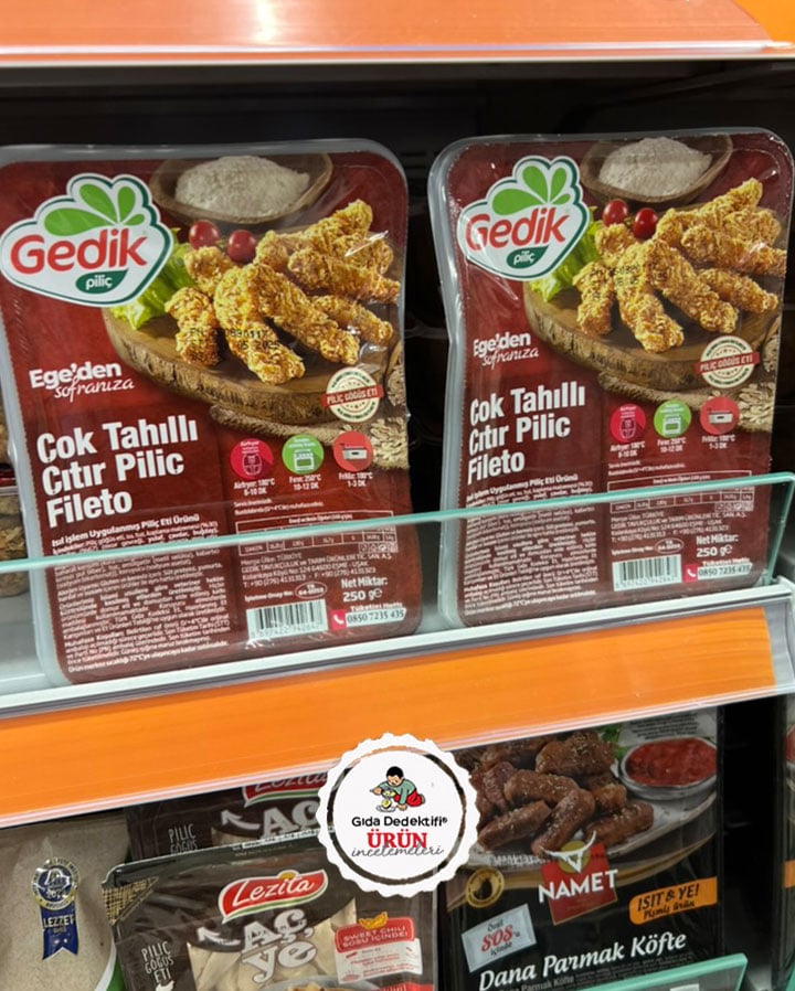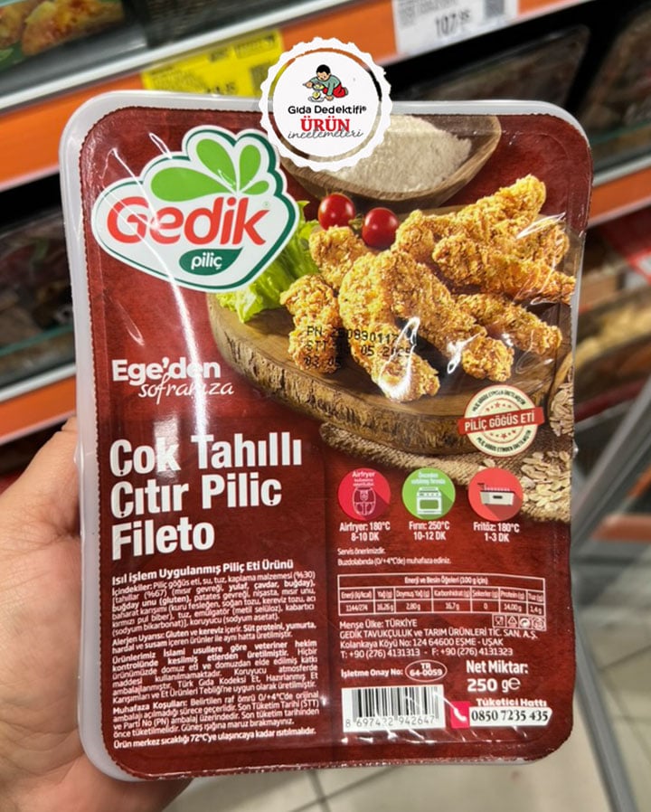 Gedik Piliç markasıyla marketlerde satışa sunulan ısıl işlem görmüş hazır gıda ürünlerinden birini inceleyeceğiz: Çok Tahıllı Çıtır Piliç Fileto. "Ege'den Sofranıza" sloganıyla 250 gr'lık paketlerde satışa sunulan ürün, "Piliç Göğüs Eti" ibaresiyle dikkat çekiyor. Ürün Gedik Tavukçuluk ve Tarım Ürünleri Tic. San. A.Ş. tarafından Uşak Eşme'deki tesislerde üretiliyor. Ürün airfryer, fırın ve fritözde pişirilebilecek şekilde hazırlanmış olup, ısıl işlem uygulanmış piliç eti ürünü kategorisinde satılıyor.