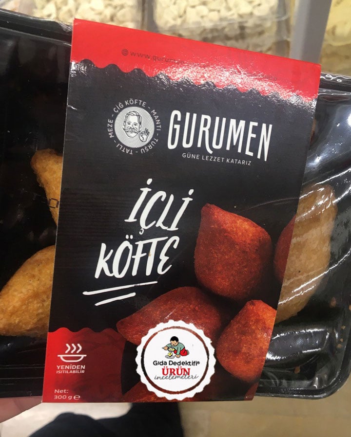Migros mağazalarında dikkatimizi çeken içli köfte ürününü inceleyeceğiz: Gurumen İçli Köfte. Ürün 300 gr.’lık ambalajlarda satılıyor ve ambalaj içinde dört adet içli köfte bulunuyor. Buna göre tek adet içli köftenin 75 gr. olduğunu hesaplıyoruz. Tabi içli köfte demişken, karşımıza restoranlarda çıkan içli köftelerin tek tek içeriklerini bilmiyoruz fakat inceleyeceğimiz bu ürünün içeriğinde çeşitli katkı maddeleri olduğunu şimdiden belirtelim. Etiket bilgilerinden gördüğümüz kadarıyla ürün Gurumen Gıda tarafından İzmir Buca’daki tesislerde üretiliyor.
