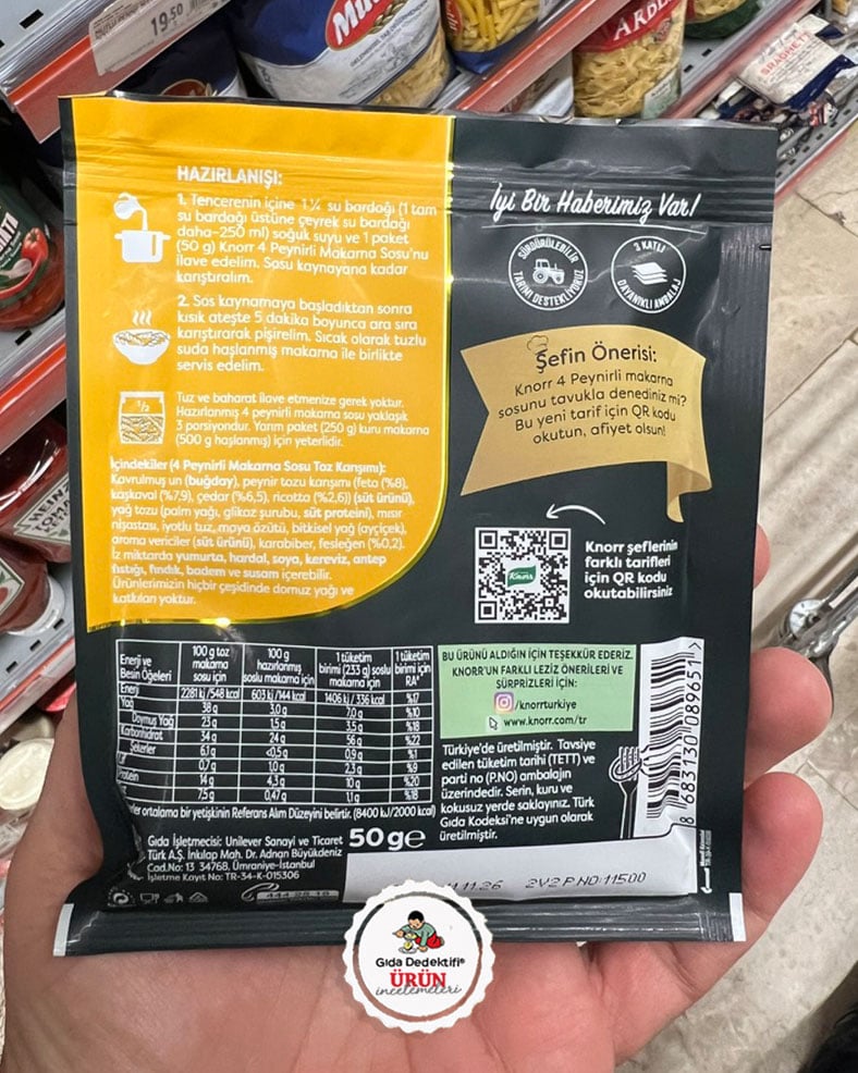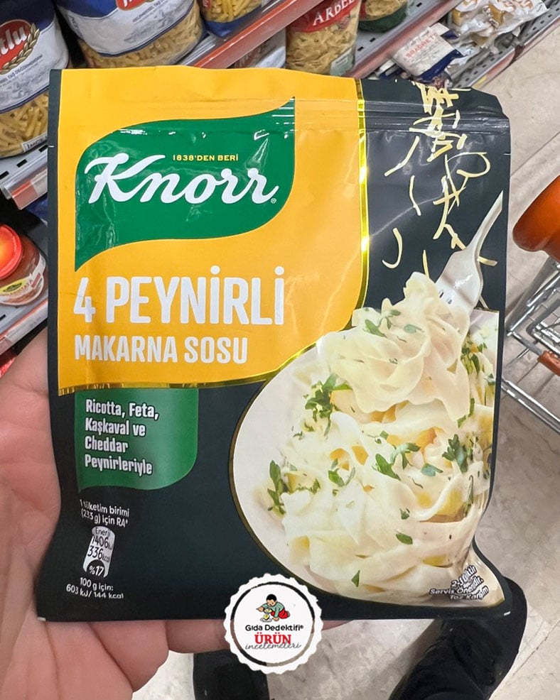 Unilever firması tarafından Türkiye’de üretilerek satışa sunulan Knorr markalı 4 Peynirli Makarna Sosu ürününü inceleyeceğiz. Ürün 50 gr’lık ambalajlarda satışa sunuluyor ve ambalajın ön yüzünde rendelenmiş peynirler ile peynir ve fesleğenli makarna görselleri yer alıyor. Ürünün ambalajında ayrıca söz konusu ürünün İstanbul’daki Unilever Sanayi ve Ticaret A.Ş. tesislerinde üretildiği de anlaşılıyor.
