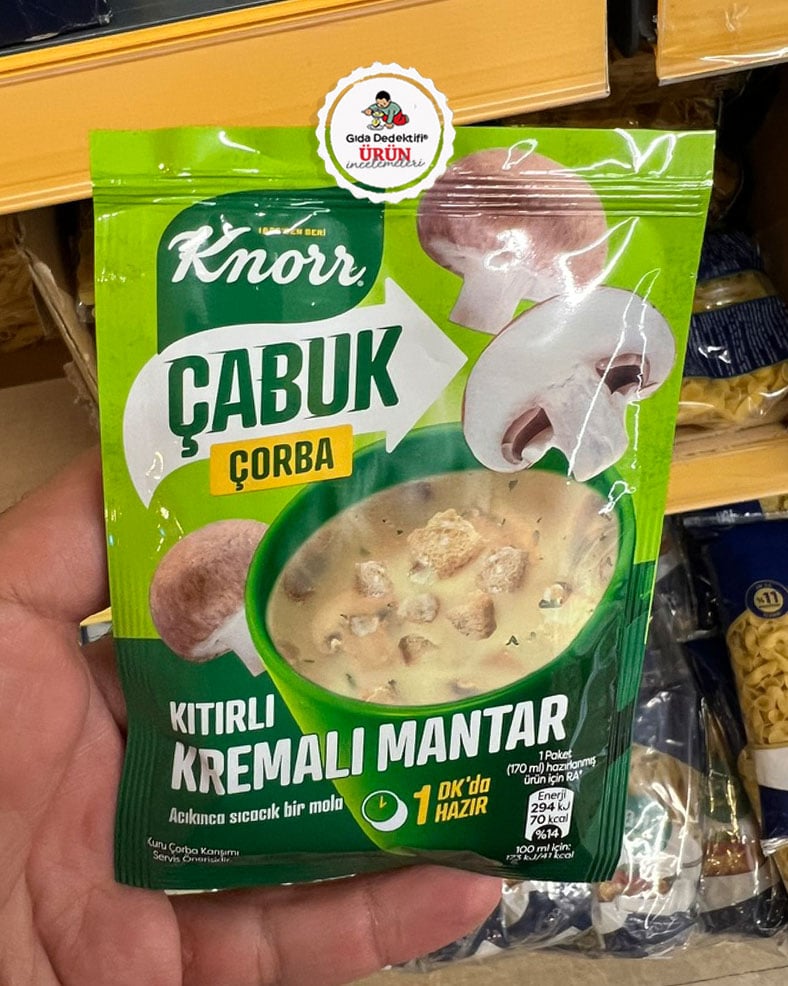 Knorr markasıyla satışa sunulan ve ambalajında büyük mantar görselleri bulunan kıtırlı kremalı mantar çorbasının içeriğini inceleyeceğiz. Ürün çabuk çorba konseptinde “1 dakikada hazır” ve “Acıkınca sıcacık bir mola” ifadeleriyle satılıyor. 19 gramlık paketlerde satışa sunulan ürün 170 ml kaynar su eklenip karıştırılarak 1 dakikada hazır hale getiriliyor. Ürün Unilever’e ait Besan Besin Sanayi ve Ticaret A.Ş. firmasına ait İstanbul’daki tesislerde üretiliyor.