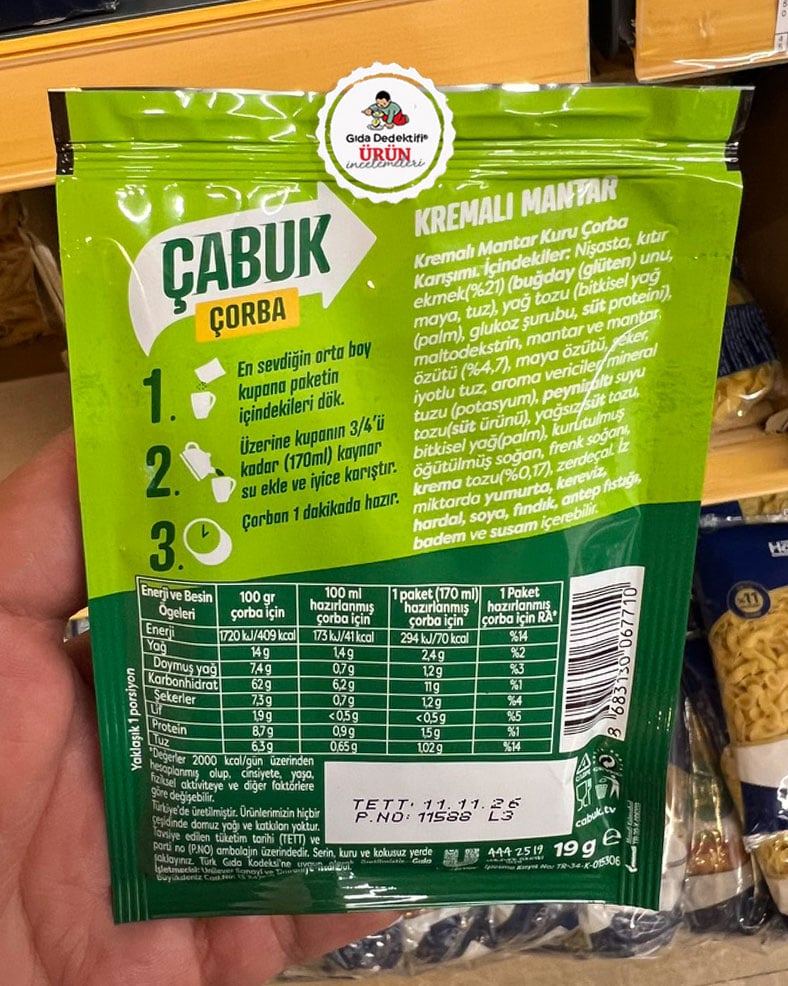 🔍İçindekiler: Nişasta, Kıtır ekmek (%21) [Buğday unu, Maya, tuz], Yağ tozu [Bitkisel yağ (Palm), Glikoz şurubu, Süt proteini], Maltodekstrin, Mantar ve mantar özütü (%4,7), Maya özütü, Şeker, İyotlu tuz, Aroma vericiler, Mineral tuzu, Peyniraltı suyu tozu, Yağsız süttozu, Bitkisel yağ (Palm), Kurutulmuş öğütülmüş soğan, Frenk soğanı, Krema tozu (%0,17), Zerdeçal