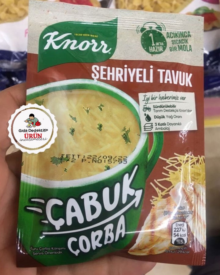 Daha önce yaptığımız hazır çorba ve bulyon paylaşımlarından sonra şimdi de çabuk çorba olarak satılan ürünlerden birini inceleyeceğiz; Knorr Şehriyeli Tavuk Çabuk Çorba. Ürün 17 gr.’lık paketlerde satılıyor. Paketteki bilgilere göre ürünü bir fincanın dörtte üçü kadar kaynar suyla karıştırınca bir dakikada tüketime hazır hale geldiği yazıyor.Ürün içeriğine baktığımızdaysa ilk sırada %35 oranıında şehriyenin yanında sırasıyla nişasta bazlı bir şeker olan maltodekstrin ve Nişasta dikkatimizi çekiyor. Buradan da ürünün temel bileşenlerinden birinin bir glikoz şurubu türevi olan maltodekstrin olduğunu anlıyoruz.