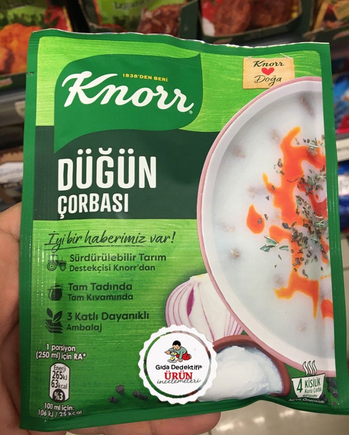 Yıllardır Anadolu’nun her köşesinde yoğurt ve kuzu eti içeriğiyle; özellikle bayramlarda, düğünlerde ve tüm özel günlerde hazırlanan düğün çorbasının endüstriyel halini Knorr Düğün Çorbası üzerinden inceleyeceğiz. Ürün 72 gr.’lık paketlerde, 4 kişilik porsiyon olarak hazırlanacak şekilde satılmaktadır. Paket içindeki toz karışımdan 4 kişiye 250 ml.’lik porsiyonlar olmak üzere toplam 1 litrelik çorba hazırlanabiliyor.