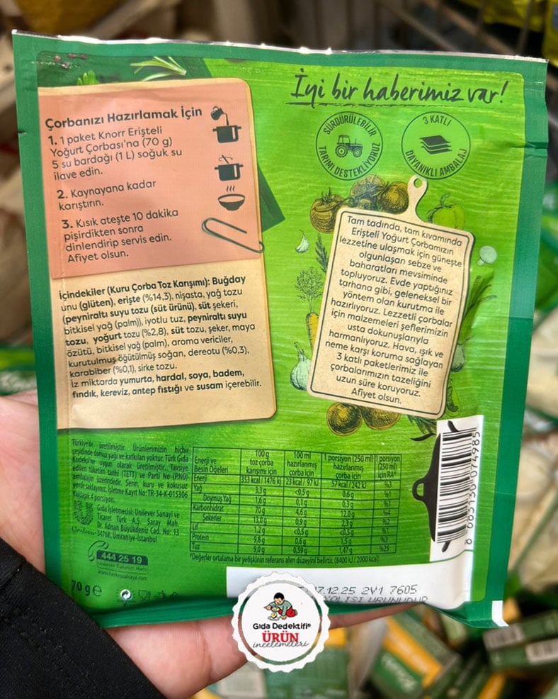 Hazır toz çorba karışımlarıyla bilinen Knorr markasıyla satışa sunulan erişteli yoğurt çorbasını inceleyeceğiz. Ürün 70 gr’lık paketlerde üzerinde yoğurt, erişteTürkiye’de ve karabiber görselleriyle donatılmış şekilde satılıyor. İstanbul’daki Unilever tesislerinde üretilen ürünün ambalajında ayrıca “evde yaptığınız tarhana gibi, geleneksel bir yöntem olan kurutma ile hazırlıyoruz” ibareleri yer alıyor.