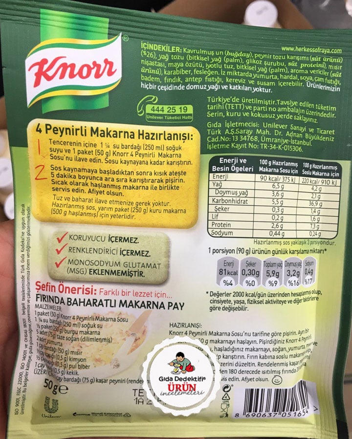 Marketlerde yaygın olarak satılan ve makarna tüketiminin yoğun olduğu ülkemizde tercih de edilen bir üründen bahsedeceğiz; Knorr İtalyan Usulü 4 Peynirli Makarna Sosu. Ürün Unilever firması tarafından Türkiye’de üretiliyor ve 50 gr.’lık ambalajlarda satılıyor.
