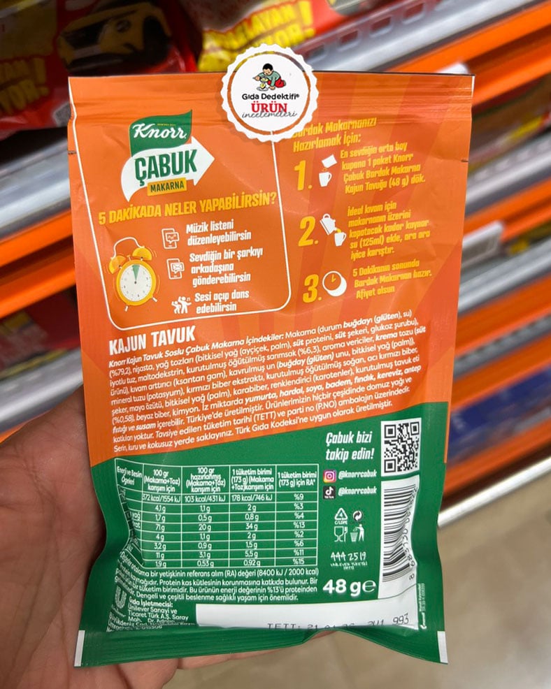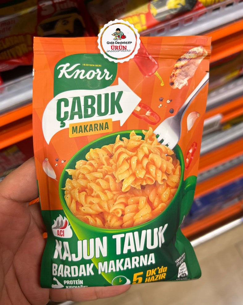 Knorr markasıyla üretilerek satışa sunulan çabuk makarna ürünlerinden Kajun Tavuk Bardak Makarna ürününü inceleyeceğiz. “5 dakikada hazır” ve “Protein kaynağı” ibareleriyle 48 gr’lık paketlerde satışa sunulan ürünün Unilever’a ait Lipton ürünlerinin de üretildiği Besan Besin Sanayi ve Ticaret A.Ş. tesislerinde üretildiği anlaşılıyor. Ürün ambalajında ayrıca tavuk ve acı biber görselleri dikkat çekiyor.