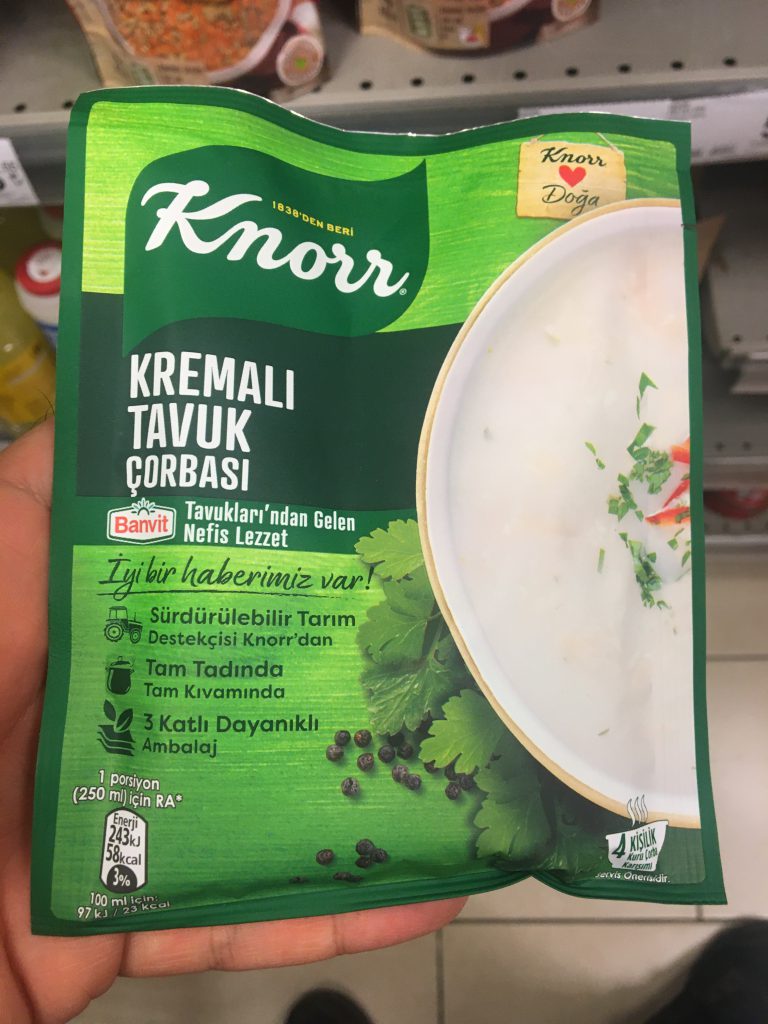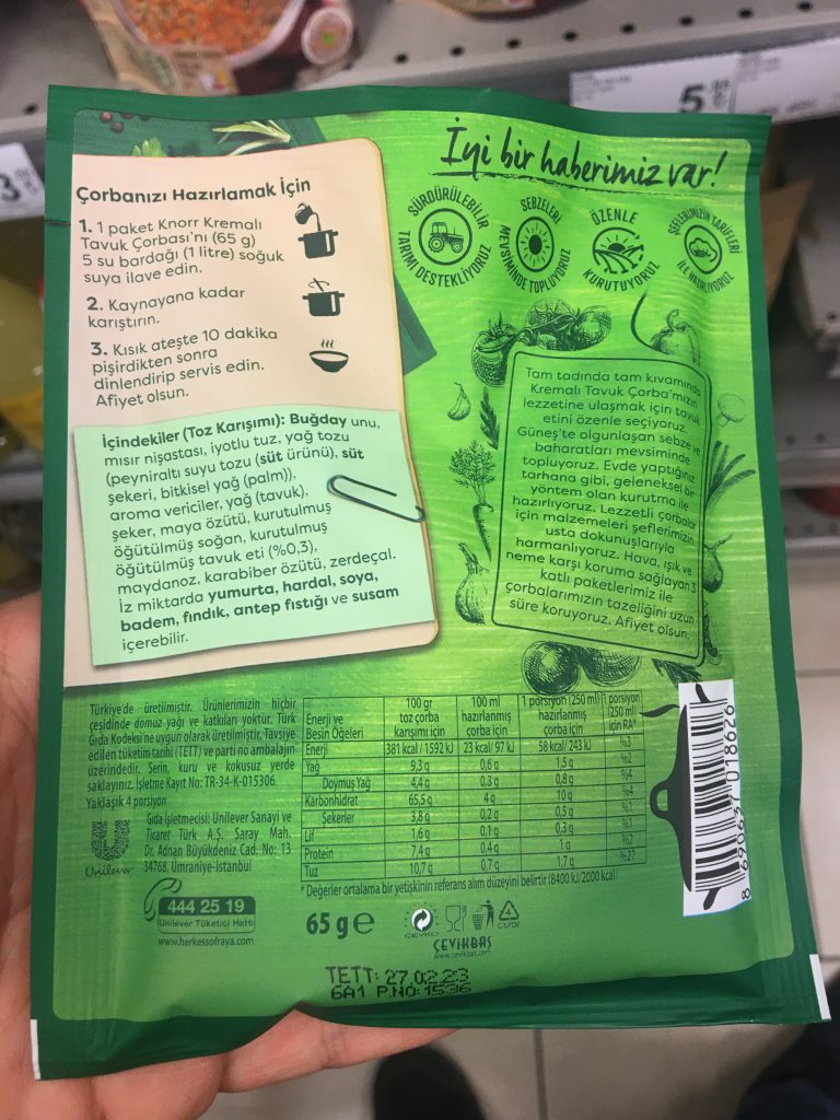 Yıl boyunca reklamlarda daha sık gördüğümüz hazır çorbalardan birini inceleyeceğiz; Knorr Kremalı Tavuk Çorbası. 65 gr.’lık paketlerde toz karışım olarak satılan çorbanın ambalajında “Banvit tavuklarından gelen nefis lezzet” ifadesi yer alıyor. Ambalajda ayrıca “İyi Haberlerimiz Var!” başlığı altında “Sürdürülebilir tarım destekçisi Knorr’dan” “Tam tadında, tam kıvamında” ve “3 katlı dayanıklı ambalaj” ifadeleriyle tüketiciye sunuluyor.