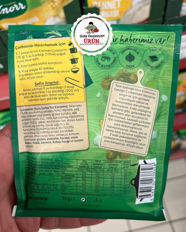 Daha önce farklı çeşitleriin incelediğimiz Knorr markalı toz çorba karışımı ürünlerinden Tavuk Suyuna Cennet Çorbası çeşidini inceleyeceğiz. Ürün 76 gr’lık paketlerde satışa sunuluyor ve tek paket ile 4 kişilik çorba hazırlanıyor. Hazırlama talimatlarına bakıldığında tek paket toz karışıma 5 su bardağı yani 1 litre su eklenerek kaynatılıp karıştırılıyor. Ürün ambalajında “sürdürülebilir soğan” ve “Anadolu’da yetişmiş mısır unuyla” ifadeleri yer alıyor.