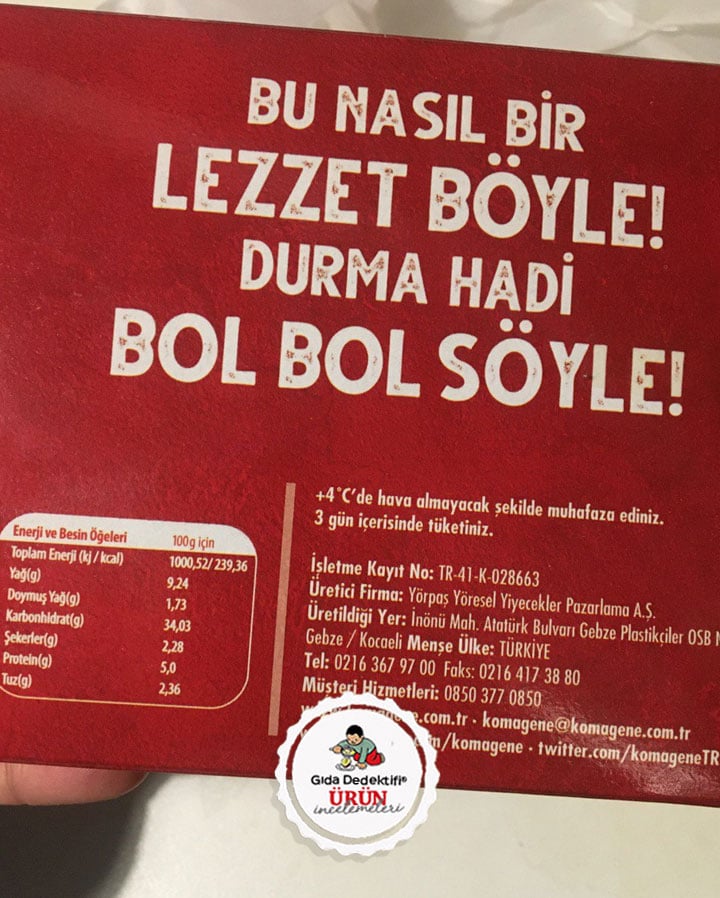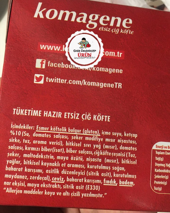 Ramazan ayında %50 kampanyasıyla dikkat çeken ve geleneksel tatlarımızdan olduğu için çokça tercih edilen tüketime hazır etsiz çiğ köftelerden birini inceleyeceğiz; Komagene Çiğ Köfte. Ürün çok farklı gramajlarda satılıyor fakat 200 gr.’lık porsiyon tek kişilik olarak kabul ediliyor. Ürün içeriğini etiket bilgisi üzerinden sizlere aktarıyoruz.