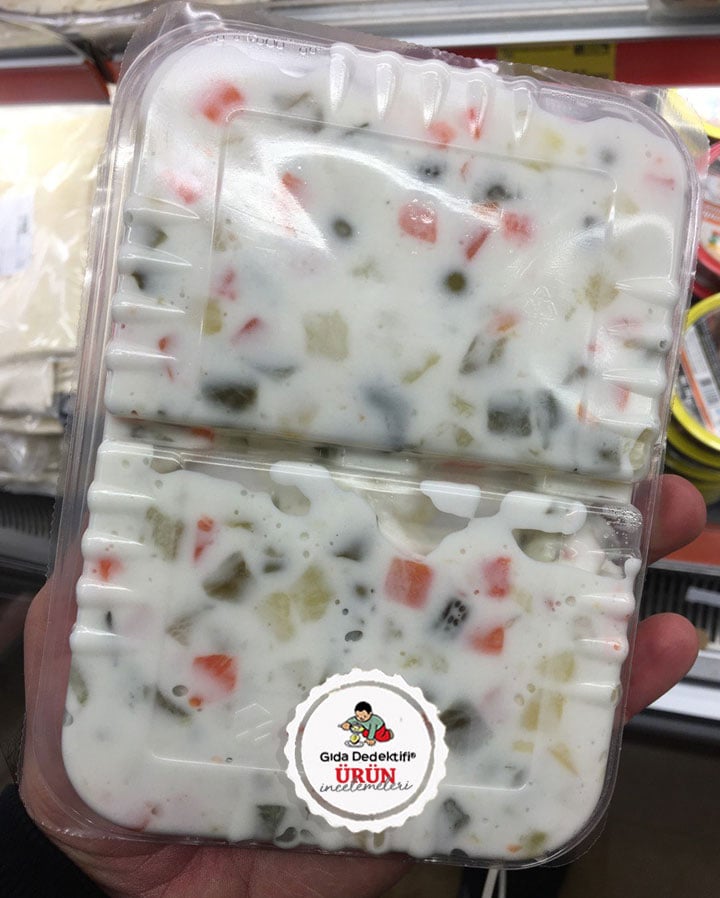 🔎İçindekiler: Patates (%30), Mayonez (%30) [Su, Ayçiçek yağı, Mısır nişastası, Şeker, Tuz, Asitlik Düzenleyici (Sitrik asit), Koruyucu (Potasyum Sorbat)], Havuç (%19), Salatalık turşusu, Bezelye (%9), Koruyucu (Potasyum Sorbat, Sodyum Benzoat)