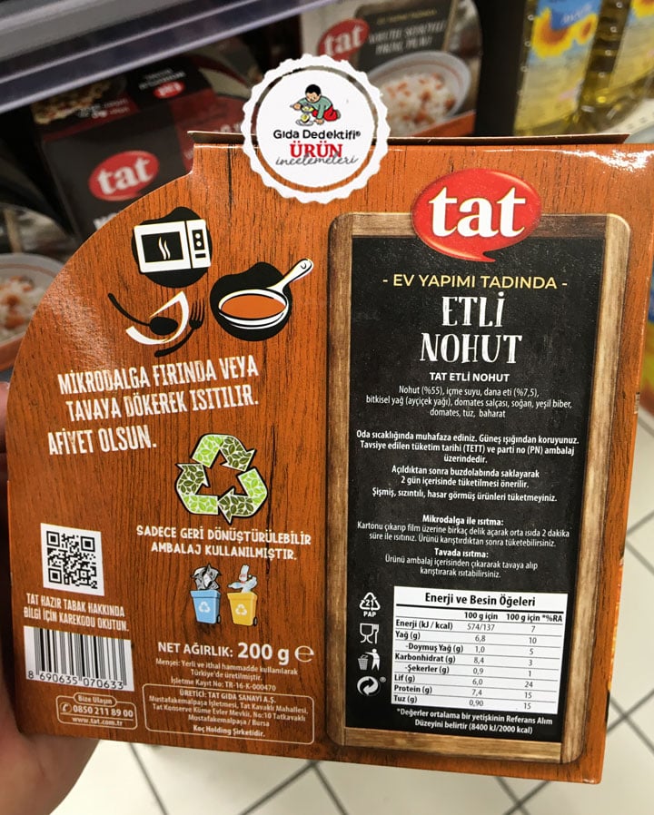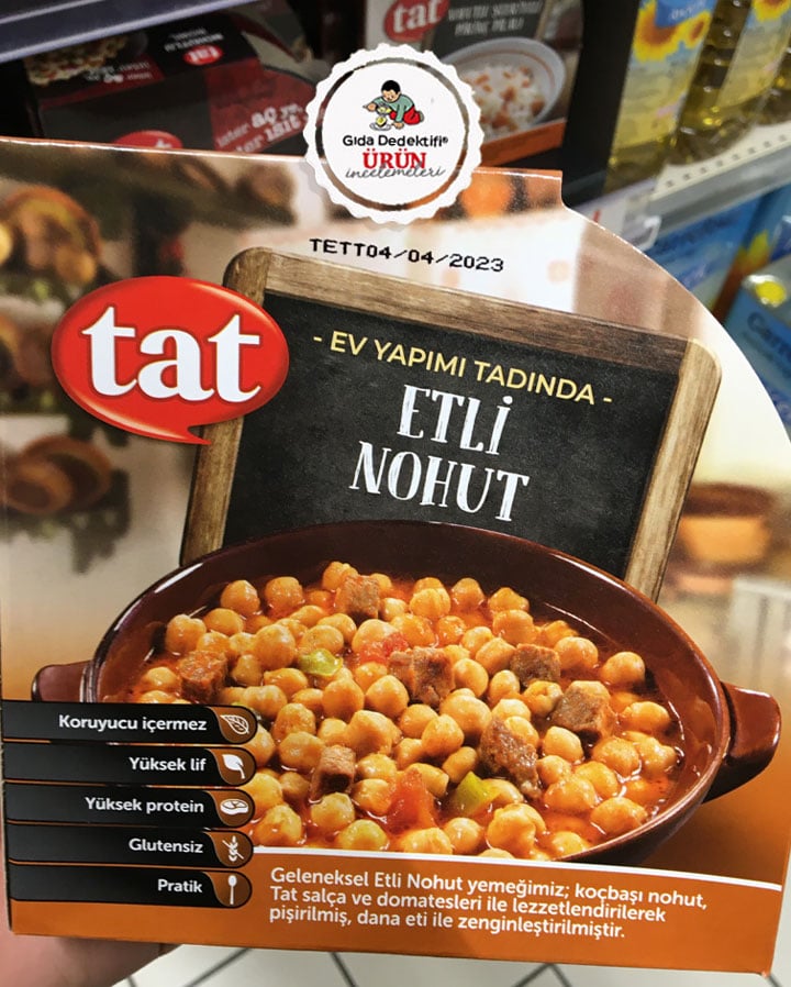 Geleneksel yemeklerimizi içeriğinde katkı ya da koruyucu madde bulunmadan üreten firmaların, market raflarında gittikçe çeşitlenen hazır yemek ürünlerinden birini inceleyeceğiz: Tat Etli Nohut. Ürün 200 gr.’lık paketlerde satılıyor. Ürün Tat Gıda Sanayi A.Ş.’ne ait Bursa’daki tesislerde üretiliyor. Ürün paketindeyken mikrodalga fırında ya da tavaya dökülerek ısıtılarak yemeye hazır hale getiriliyor. Ürün ambalajının ön yüzünde “Koruyucu içermez”, “Yüksek lif”, “Yüksek protein” ve “Glutensiz” ifadeleri göze çarpıyor.