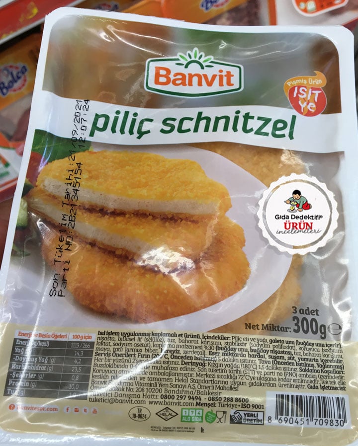 Avusturya’da çokça tüketilen ve bilinen schnitzel; temelde gayet ince kesilmiş bir dilim tavuk etinin sırasıyla una, yumurta sarısına ve galeta ununa bandırılarak kızgın yağda kızartılmasıyla yapılan bir yemek türüdür. Ülkemizde de pişmiş halde ısıtılarak tüketime hazır paketli ürün olarak satılan schnitzel ürününün Banvit markasıyla satılan çeşidin inceleyeceğiz. Üründe Helal sertifikası beyanı bulunuyor ve üründe kullanılan piliçlerin “tek tek, elle kesildiği” beyan ediliyor. Ürün 100 gr.’lık üç adet schnitzel bulunan 300 gr.’lık paketlerde satılıyor.