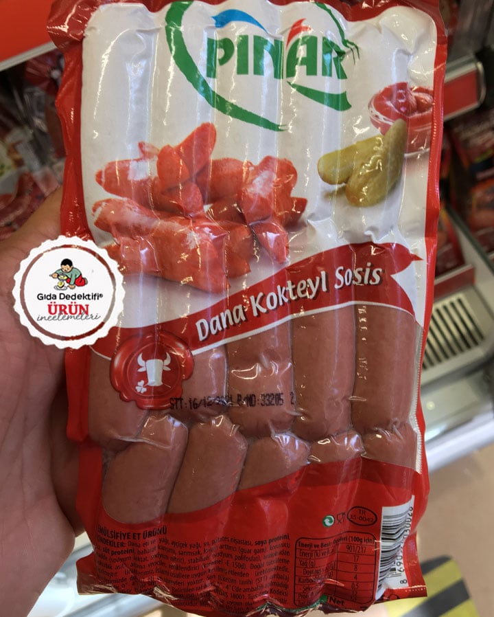 Market raflarında çok uzun yıllardır gördüğümüz ve bir dönem Türkiye’de son derece popüler olan sosis ürünlerinden birini, yine uzun yıllardır raflarda yer alan Pınar markalı Kokteyl Dana Sosis üzerinden inceleyeceğiz. 215 gr’lık paketlerde toplam 15 adet ufak boy sosis içeren ürün ambalajında “dana görseli” dikkat çekiyor. Diğer ürünlerde olduğu gibi bu ürünün de mevzuata göre yasal ismi “sosis” değil, “emülsifiye” yani işlenmiş et ürünü olarak geçiyor.