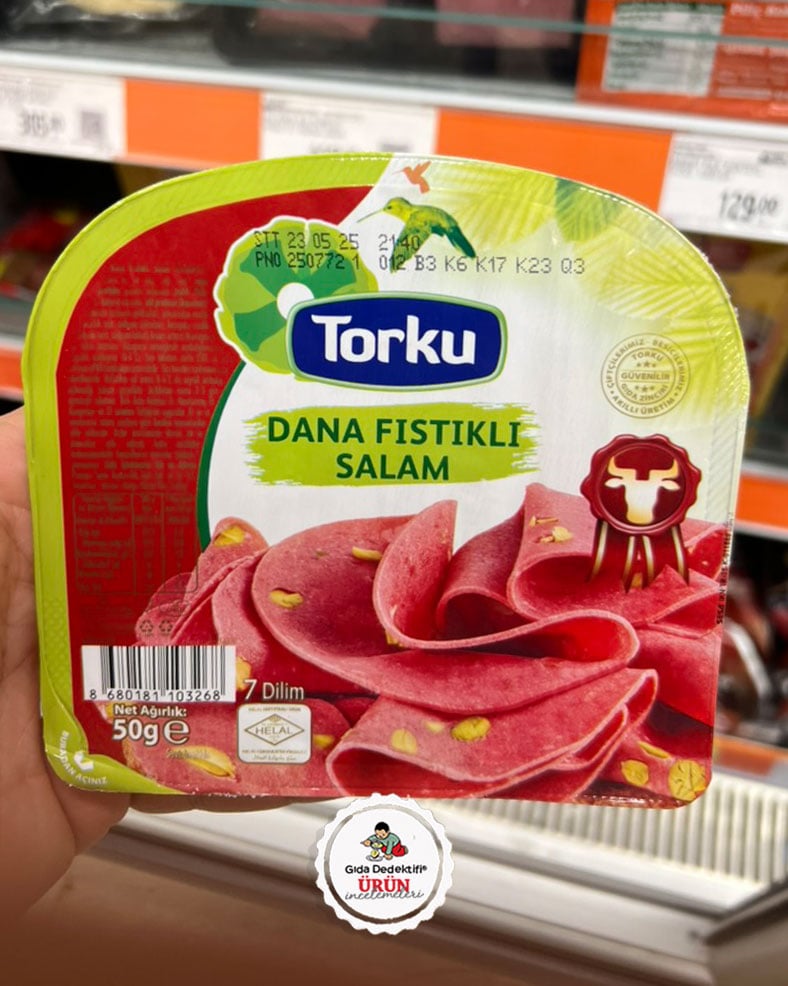 Torku markasıyla satışa sunulan dana fıstıklı salam ürününü inceleyeceğiz. Panagro Tarım firması tarafından Konya’da üretilen ürün 50 gr’lık paketlerde satışa sunuluyor. Ürün ambalajının ön yüzünde dana sembolü ile “Çiftçilerimiz, besicilerimiz, akıllı üretim, güvenilir gıda zinciri” gibi ifadelerin yer aldığı bir logo yer alıyor. 50 gr’lık tek pakette 7 dilim salam bulunduğu anlaşılırken, bu da tek dilim salamın yaklaşık 7 grama denk geldiğini gösteriyor.