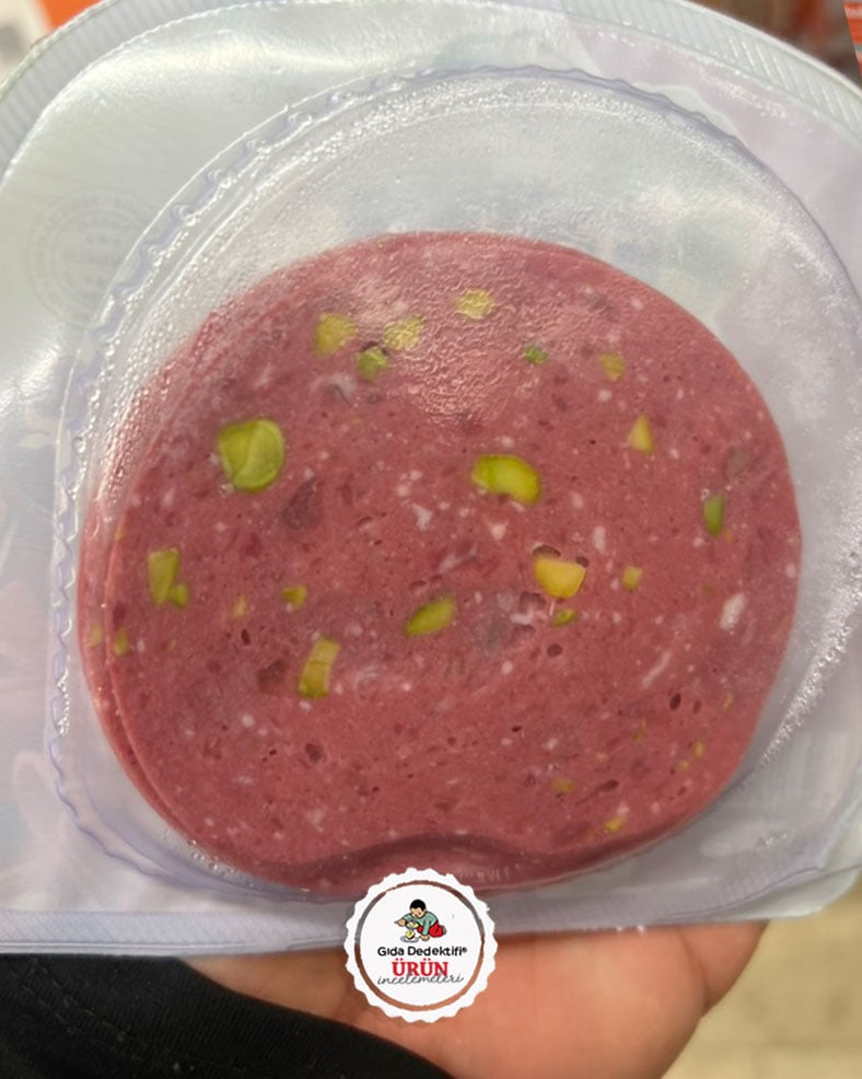 Ürün içeriğine baktığımızda ilk 3 sırada; Dana eti ve yağı, sığır yağı ve soya proteini olduğunu görüyoruz. Üründe temel bileşen olarak dikkat çeken ve ilk 2 sırada yer alan dana eti ile dana yağı ve sığır yağı oranları tüketiciye açıkça beyan edilmiyor. Ürün içeriğinde soya proteininin yanı sıra ayrıca patates nişastası bulunduğu görülüyor. Bu bileşenlerin de üründeki oransal dağılımı bilinmiyor. Üründe mevzuat gereği sadece fıstık oranı beyan ediliyor. Üründe kullanılan fıstığa ilişkin olarak Antep fıstığı ibaresi yerine “fıstık” ibaresi dikkat çekerken, fıstığın menşe ülkesi de bilinmiyor. Ürün içeriğinde %3 oranında fıstık bulunurken, bu da 50 gr’lık tek pakette 1,5 gr fıstığa tekabül ediyor. Üründe bu temel bileşenlerin yanında sırasıyla; Tuz, baharat karışımı, süt proteini ile çeşitli katkı maddeleri yer aldığı görülüyor. Ürün içeriğinde stabilizör, antioksidan, koruyucu ve kıvam arttırıcı katkı maddelerinin yanı sıra, tütsü aroma vericisi bulunduğu anlaşılıyor. Son olarak ürün içeriğinde koruyucu olarak sodyum nitrit ve sodyum laktat ile kıvam arttırıcı olarak karragenan kullanıldığını da söyleyelim.