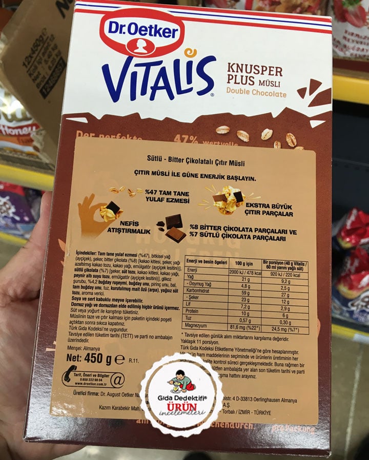 Artık süpermarket raflarında çok sayıda kahvaltılık gevrek ve müsli ürünlerine rastlıyoruz. Sizlerle market raflarında rastladığımız ve Almanya’dan ithal edilerek ülkemizde satışa sunulan Dr. Oetker Vitalis markalı Knusper Plus Sütlü ve Bitter Çikolatalı Müsli ürününü inceleyeceğiz. Ürün 450 gr.’lık paketlerde satılıyor. Etiketteki tarifine göre ürünün tek porsiyonu; 40 gr. müsli ile 60 ml. yarım yağlı süt ile hazırlanıyor. Ürün ambalajında ayrıca “%47 tam tane yulaf ezmesi”, “Büyük çıtır parçalar”, “Bitter ve sütlü çikolata parçaları” gibi ifadeler yer alıyor.