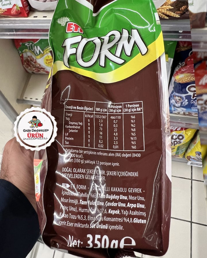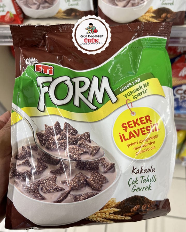Market raflarında çok farklı çeşitlerini görmeye başladığımız ve genellikle “kahvaltılık gevrek” olarak isimlendirilen ürünlerden birini inceleyeceğiz: Eti Form Kakaolu Çok Tahıllı Gevrek. 350 gr’lık paketlerde satışa sunulan ürün ambalajındaki “şeker ilavesiz” ibaresiyle dikkat çekiyor. Ürün içeriğinde ilave şeker olmadığı, şekerin meyvelerden geldiği belirtiliyor. Üründe ayrıca “düşük yağ” ve “yüksek lif” bulunduğu beyan ediliyor.