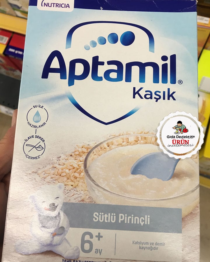 Uzun zamandır incelemediğimiz tahıl bazlı bebek ve küçük çocuk ek gıdalarından Aptamil Kaşık markalı Sütlü Pirinçli mamayı inceleyeceğiz. Ürün ambalajıda “Su ile hazırlanır” ve “İlave şeker içermez” ifadeleri dikkat çekiyor. Ürünün ayrıca 6 ay ve üzeri bebekler için uygun olduğu beyanı ile “kalsiyum ve demir içerdiği” sağlık beyanı ambalajın ön yüzünde yer alıyor. Ürün 250 gr.’lık paketlerde satılıyor.