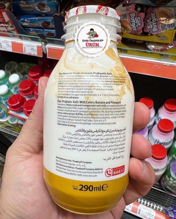 🔍İçindekiler: Pastörize ve homojenize inek sütü, Kerevizli muzlu ananas preparatı (%15) [Su, İyonize elma suyu konsantresi, Muz püresi (%5), Kıvam arttırıcı (Modifiye nişasta), Ananas konsantresi (%1), Aroma vericiler (Ananas, muz, kereviz), Kereviz ekstraktı (%0,01), Asitlik Düzenleyici (Sitrik asit)], Kefir kültürü, Porbiyotik mikroorganizma (Bifidobacterium ve lactobacillus acidophlius)