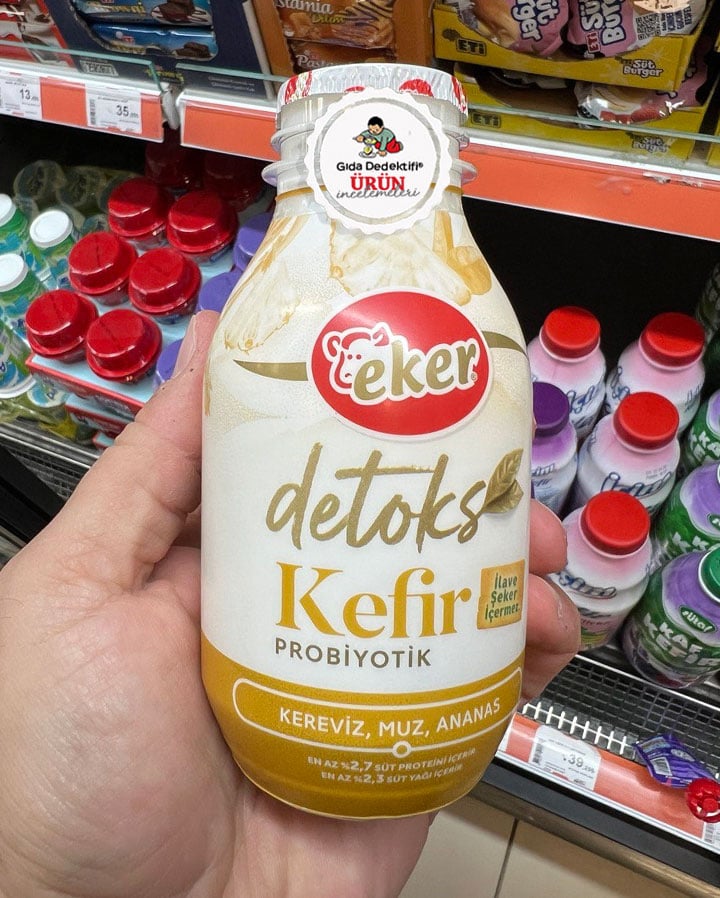Eker markasıyla satışa sunulan kefir ürünlerinin son dönemde market reyonlarında gördüğümüz “detoks” çeşitlerinden birini inceleyeceğiz; Eker Detoks Kefir Kereviz, Muz, Ananas. Ürün 290 ml’lik plastik şişelerde satışa sunuluyor. Ürün ambalajında “ilave şeker içermez” ifadesi bulunuyor. Üründe ilave sofra şekeri yer almazken, nişasta bazlı şeker türevleri ya da tatlandırıcı da içermiyor.