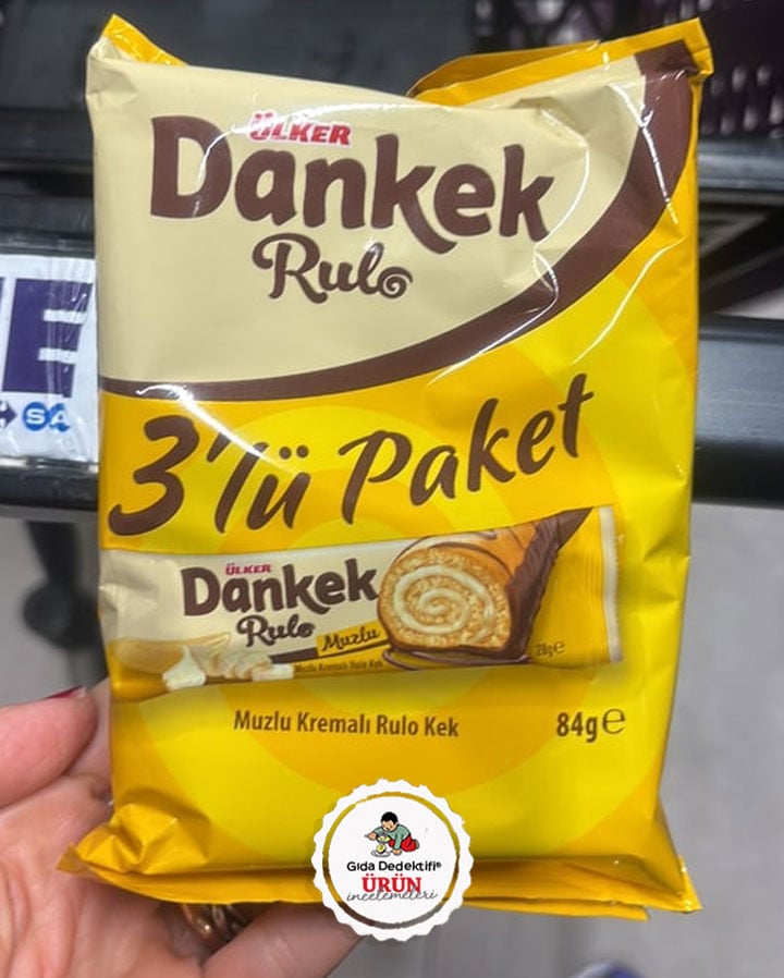 Ülker Dankek markasıyla satışa sunulan rulo kek ürünlerinden birini inceleyeceğiz: Dankek Muzlu Kremalı Rulo Kek. "3'lü Paket" olarak 84 gr'lık ambalajlarda satışa sunulan ürün, her biri 28 gr olmak üzere 3 adet tek tek paketlenmiş rulo kek içeriyor. Ürün, Ülker Bisküvi firmasına ait Kocaeli'deki tesislerde üretiliyor.