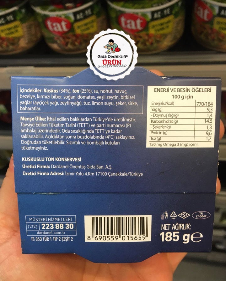 Daha önce farklı çeşitlerini incelediğimiz Dardanel yemeye hazır konseptiyle sunulan konserve ürünlerden Dardanel Kuskuslu Ton ürününü inceliyoruz. Ürün 185 gr.’lık paketlerde satışa sunuluyor. Ürün ambalajında “katkısız ve koruyucusuz” ve “18 gr. yüksek protein” ifadeleri dikkat çekiyor. Ürünün yemeye hazır konseptiyle çatalıyla birlikte satışa sunulduğu ayrıca vurgulanıyor.