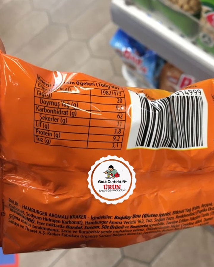🔎İçindekiler: Buğday unu, Bitkisel yağ (Palm, Ayçiçek, Pamuk, Kanola), Şeker, Kabartıcı (Amonyum Hidrojen Karbonat, Sodyum Hidrojen Karbonat), Hamburger aroma vericisi (%3), Tuz, Soğan tozu, Renklendirici (Paprika esktraktı), İnvert şeker şurubu, Un İşlem Maddesi (Sodyum Metabisülfit)