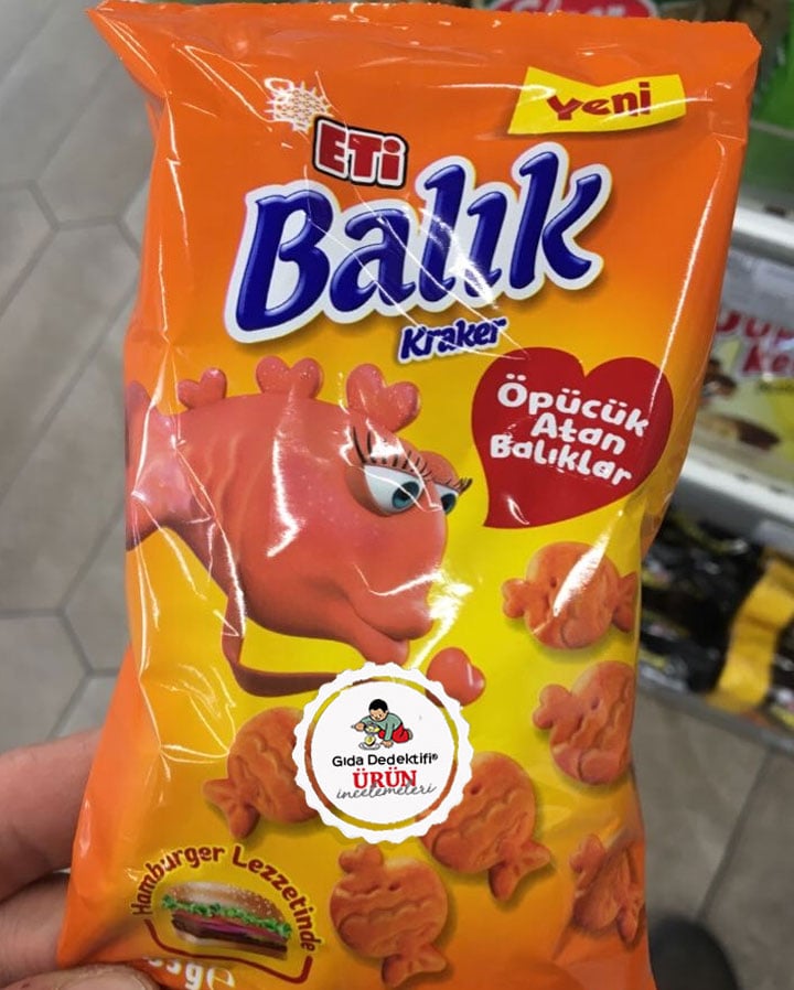 Bu kadarı da olmaz dedirten biri ürünü inceleyeceğiz; Eti Hamburger Aromalı Balık Kraker. “Hamburger aromalı derken?” diye soracak olabilirsiniz. İlk kez karşımıza çıkan bu tarz bir aromaya sahip ürünü biz de şaşırarak inceledik. Şaşırtan içeriğiyle bu ürün “öpücük atan balıklar” konseptiyle tanıtılıyor. Üründeki aroma verici oranı da genelde karşılaştığımız gibi bindelik değil, yüzdelik oranlarda ürüne eklenmiştir. Öyle ki; 35 gr.’lık tek pakette %3 oranında yani tam 1 gr. bulunan bu yapay aroma verici kimyasal bileşenin içeriğinde ne olduğunu bilmiyoruz.