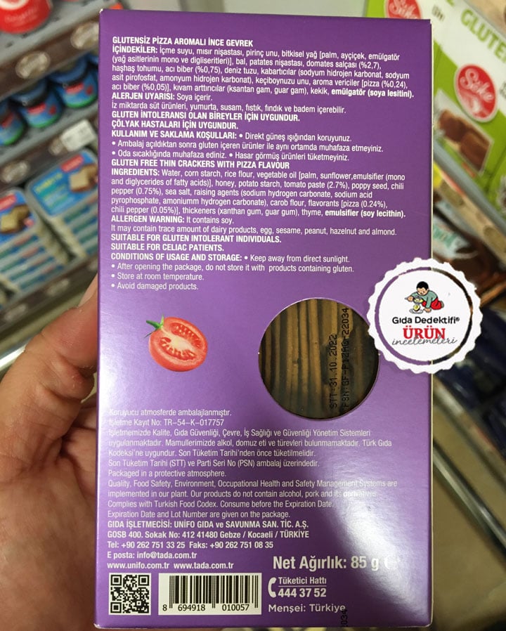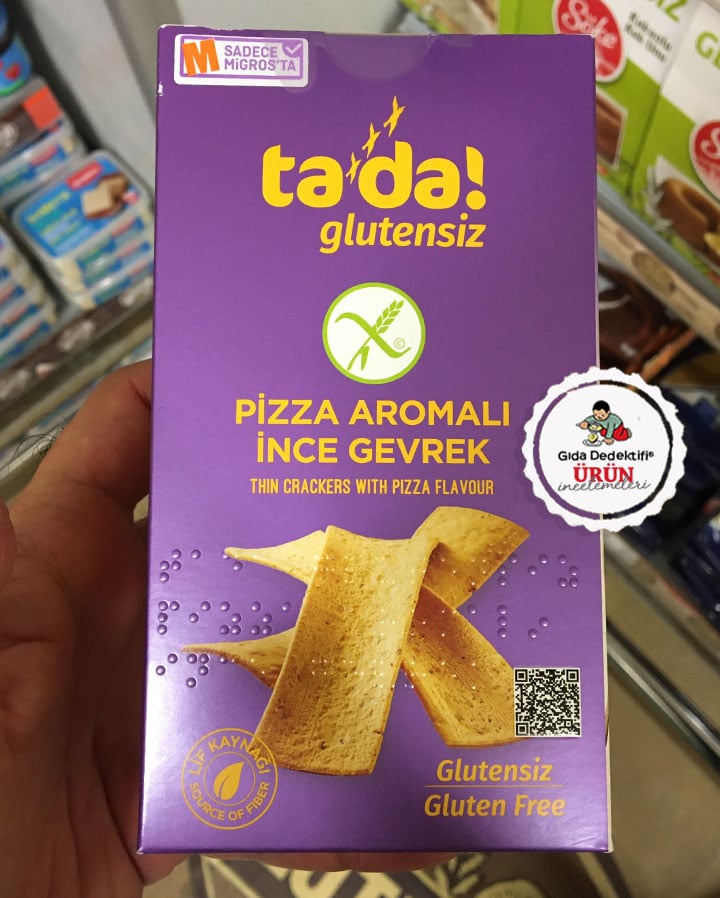 Market raflarında çeşitleri gittikçe artan glutensiz ürünlerden birini inceliyoruz; Tada Glutensiz Pizza Aromalı İnce Gevrek. Ürün 85 gr.’lık karton paketlerde satılıyor. Ürün ambalajının ön yüzünde “Glutensiz” ve “Lif kaynağı” ifadeleri yer alırken, arka yüzünde ise “Gluten intoleransı olan bireyler için uygundur” ve “Çölyak hastaları için uygundur” ifadeleri dikkat çekiyor. Çölyak hastalığı; buğday, arpa, çavdar, yulaf gibi tahıllarda bulunan bir tür protein olan glutene karşı hassasiyet ile gelişen emilim bozukluğu hastalığı olarak tanımlanmaktadır.