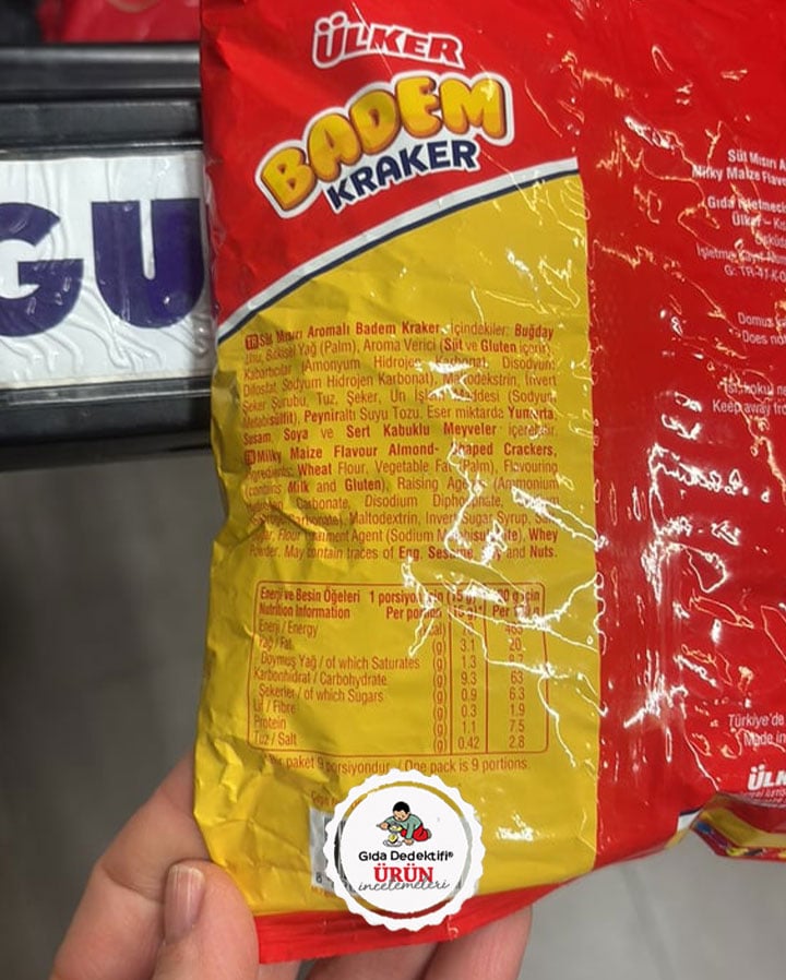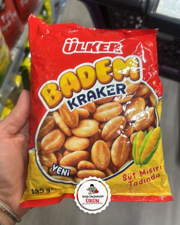 1960'lı yıllardan bu yana Ülker tarafından üretilerek satışa sunulan ve market raflarında atıştırmalık reyonunda artık bir klasik olarak yer alan ürünlerden birini inceleyeceğiz: Ülker Badem Kraker Süt Mısırı Tadında. 135 gr'lık paketlerde satışa sunulan ürünün ambalajında badem formunda krakerler ve mısır koçanı görselleri dikkat çekiyor. Ürün içeriğine baktığımızda ilk olarak dikkat çeken bir noktayı belirtmek gerekiyor: "Badem Kraker" ismiyle satışa sunulan üründe gerçek badem bulunmuyor. İngilizce etiket beyanında "Almond Shaped Crackers" yani "Badem Şekilli Krakerler" ifadesi yer alırken, Türkçe ambalajda bu ayrıntı açıkça belirtilmiyor. Bu haliyle ürünün badem içermediğini, yalnızca badem formunda şekillendirilmiş krakerler olduğunu tüketicinin fark etmesi güçleşiyor.