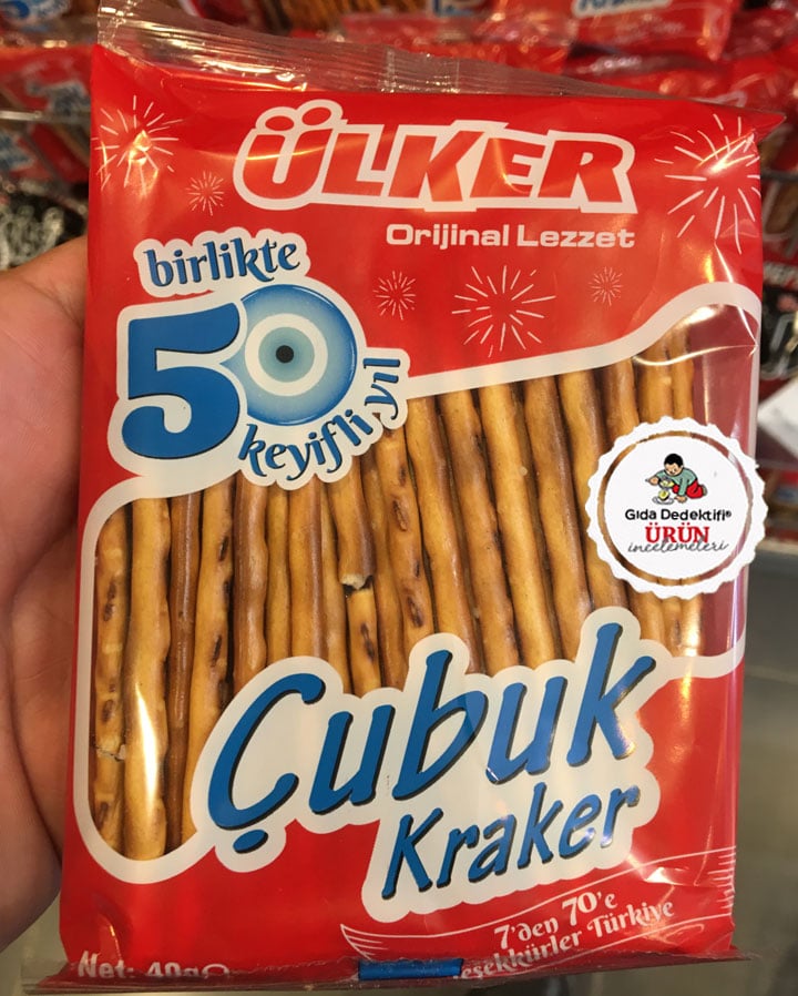 Bundan yıllar önce incelediğimiz Ülker markalı Çubuk Kraker ürününü, 50. yıl konsepti üzerine tekrar inceliyoruz. Ürünü daha önce besin değeri beyanı yapmadığı için inceleyememiştik, ürün ayrıca içeriğinde bazı değişikliklere gitmişti. Yıllar önce soya lesitini içermeyen üründe daha sonra emülgatör ilavesi olmuş, ayrıca ürün süt tozu ilave edilerek laktoz toleransı olan kişiler için tüketilmesi sıkıntılı bir ürün haline getirilmişti. Ürünün 40 gr.’lık ambalajlarda, “7’den 70’e Teşekkürler Türkiye” sloganıyla satıldığını görüyoruz.