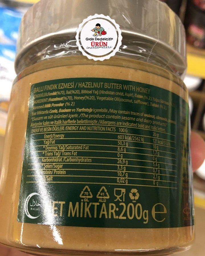 🔎İçindekiler: Fındık (%70), Bal (%20), Bitkisel yağ (Hindistan Cevizi, Aspir), Tahin (%2), Yağsız süt tozu (%2)