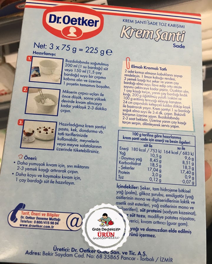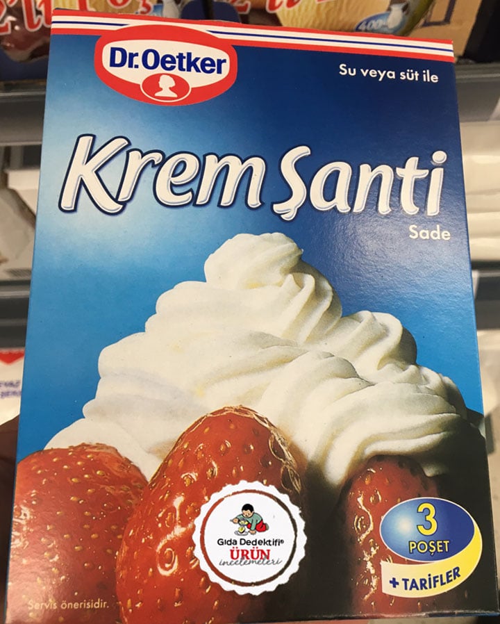 İlk tarifi 18. yüzyılda yaşayan Fransız şef François Vatel’e ait olan ve dondurma ve meyvelerin üzerini süslemek adına krema ile hazırlanan krema şanti bugün ilk tarifinden çok daha farklı tariflerle, benzer amaçlar için kullanılmaktadır. Krema Şanti’nin piyasada pek çok farklı markaya ait endüstriyel çeşitleri bulunurken Dr. Oetker markasıyla Türkiye’de üretilerek satılan ürünü inceleyeceğiz. Ürün 75 gr.’lık üç ambalajda toplam 225 gr.’lık paketlerde satılıyor. Ürün, ambalaj üzerinde yer alan tarifine göre 200 ml ya da 150 ml su ile karıştırılarak hazırlanabiliyor.