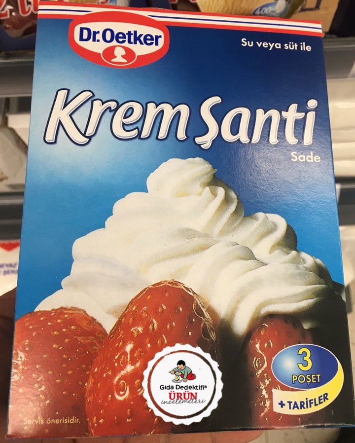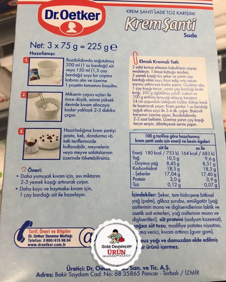 Evlerde yapılan çeşitli unlu mamullerde ve pastalarda kullanılan krem şantiyi Dr. Oetker markalı Krem Şanti toz karışımı üzerinden inceliyoruz. Ürün 75 gr.’lık 3 paketin yer aldığı kutularda satılıyor.