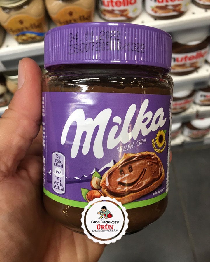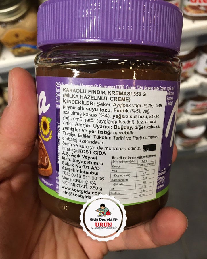 Daha önce Almanya’da market raflarında tespit ederek incelediğimiz ve son dönemlerde Kost Gıda A.Ş. tarafından ithal edilerek ülkemiz market raflarında da görmeye başladığımız Milka Kakaolu Fındık Kreması ürününü inceleyeceğiz. Ürün 350 gr.’lık cam kavanozlarda satışa sunuluyor. Ürün Belçika’da üretilerek ülkemize ithal edilliyor. Ürün ambalajının ön yüzünde ayçiçek görseli dikkat çekerken “üründe ayçiçeği yağı vardır” ifadesiyle üründeki bitkisel yağ çeşidi vurgulanıyor.