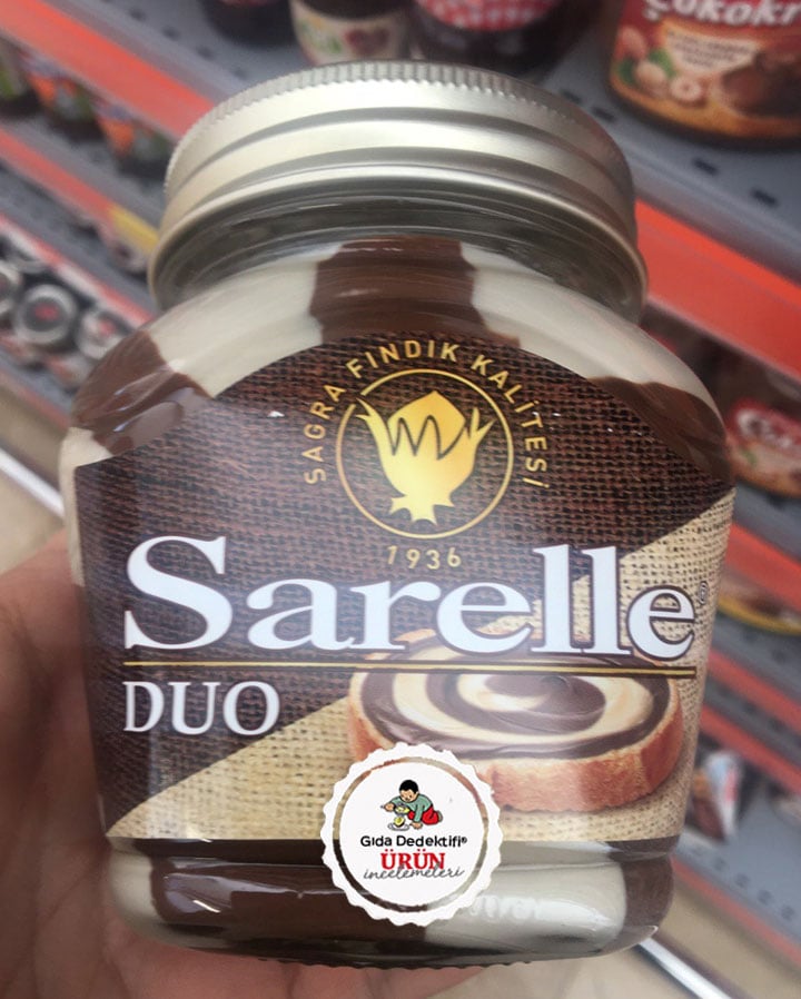 Daha önce farklı çeşitlerini incelediğimiz Sarelle Fındık Kreması’nın beyaz çikolata içeren Duo çeşidine bakıyoruz. Ürün 350 gr.’lık standart Sarelle kavanozlarında satılıyor. Ürünün sütlü çikolata ve beyaz çikolatanın homojen olmayan bir karışımı olduğu açıkça görülüyor. Ürün etiketinde trans yağ, renklendirici ve koruyucu olmadığı beyan ediliyor. Ürün Palm yağı içermeyen ender kakaolu fındık kremalarından biridir.