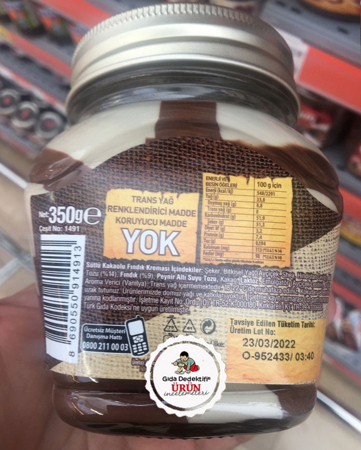 Ürün içeriğinde 3. sırada süt tozu olduğunu söylemiştik. Buna göre %14 oranında yani tek kavanozda 49 gr. süt tozu olduğunu anlıyoruz. Üründe süt bileşeni olarak ayrıca peyniraltı suyu tozu ve laktoz ilavesi yer alıyor. Ürün emülgatör olarak soya lesitini yerine, ayçiçek lesitini içeriyor. Üründe aroma verici olarak ise; doğal aroma verici olan vanilya kullanılıyor. Bu da bileşenlerinin seçimi hususunda ürünün kalitesini gösteren etkenler olarak öne çıkıyor. Tabi bileşenler ne denli kaliteli olsa da; üründeki kalori miktarını bu bileşenler değil; şeker, yağ ve protein oranları belirliyor. Ürün bu haliyle 20 gr.’lık tek porsiyonda 109,6 kcal enerji içeriyor. Tek porsiyon ürün tüketiminde 10,3 gr. ilave şeker yani yaklaşık 5 tane küp şeker tüketiliyor. Bu şeker yüküne karşılık ürün 0,6 gr. lif içeriyor. Üründe 6,8 gr. yağ ve 1,5 gr. protein yer alıyor. Ürün etiketinde besin değerleri tablosunda ayrıca kalsiyum ve fosfor oranlarının da paylaşıldığı görülüyor. Buna göre ürünün tek porsiyonunda 22,6 mg. Kalsiyum ve 19,6 mg. Fosfor bulunuyor.