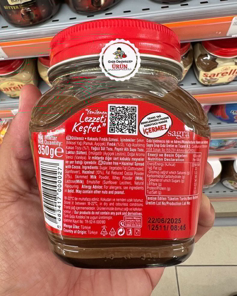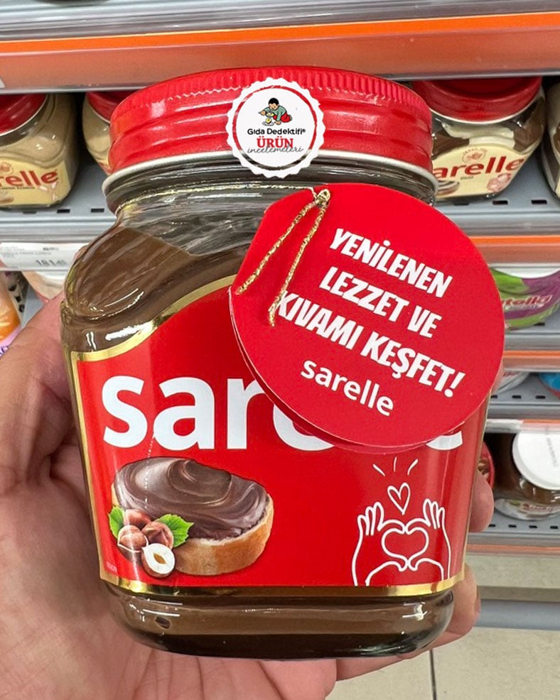 Uzun yıllardır tamamen yerli sermayeyle Ordu’da üretim yaparak Tadelle ve Sarelle markalı ürünler üreten Sagra Grup Gıda tarafından üretilen Sarelle Kakaolu Fındık Kreması ürününü inceleyeceğiz. Ürün 350 gr’lık cam kavanozlarda satışa sunuluyor ve üzerinde “yenilenen lezzeti keşfet” ifadeleri yer alıyor. İncelediğimizde üründeki kakao tozu oranının daha önceki ürünlere kıyasla %2 oranında arttırıldığını görüyoruz.
